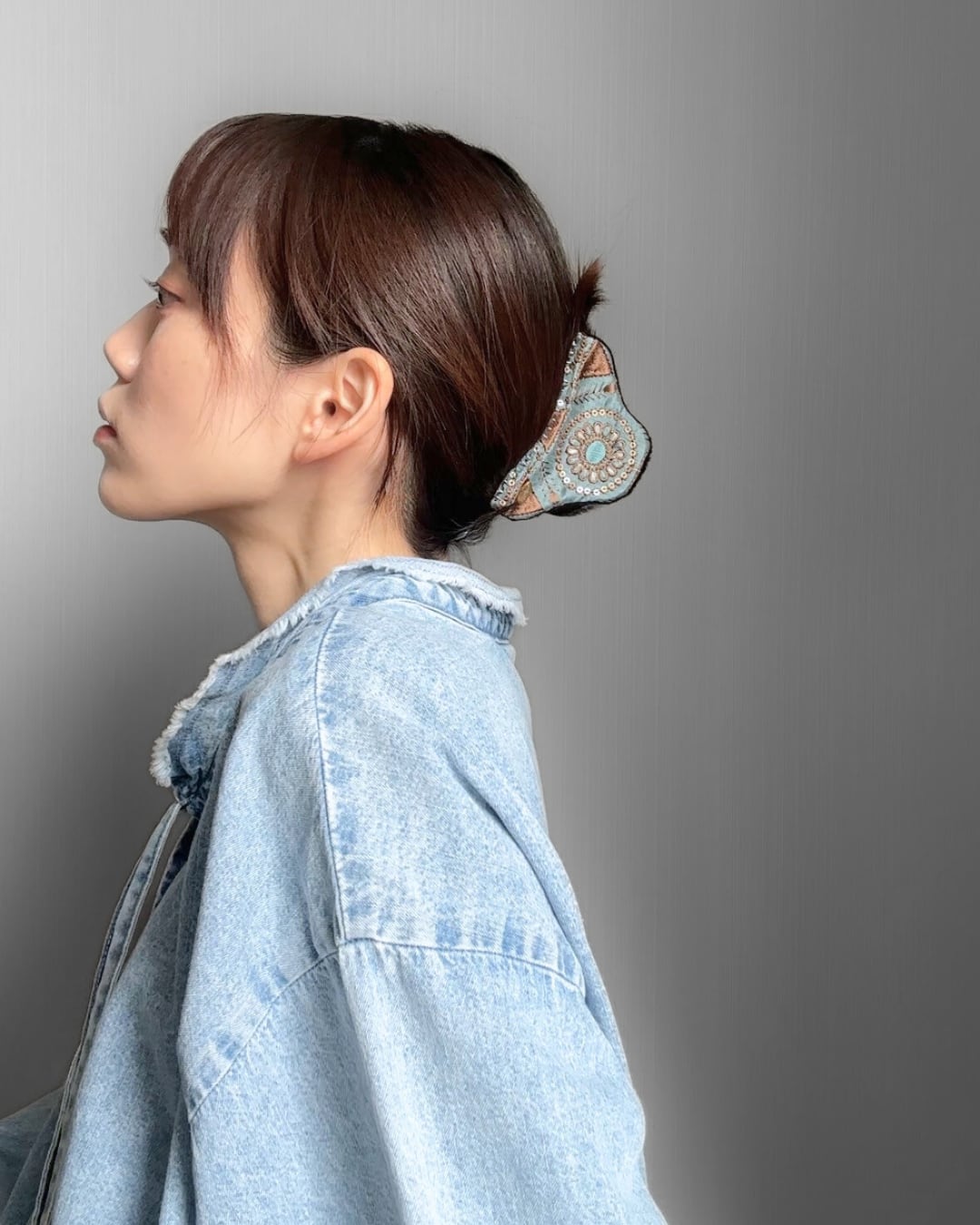 インド刺繍リボンからフリーハンドで切り取り、ひとつひとつ手縫いしています。