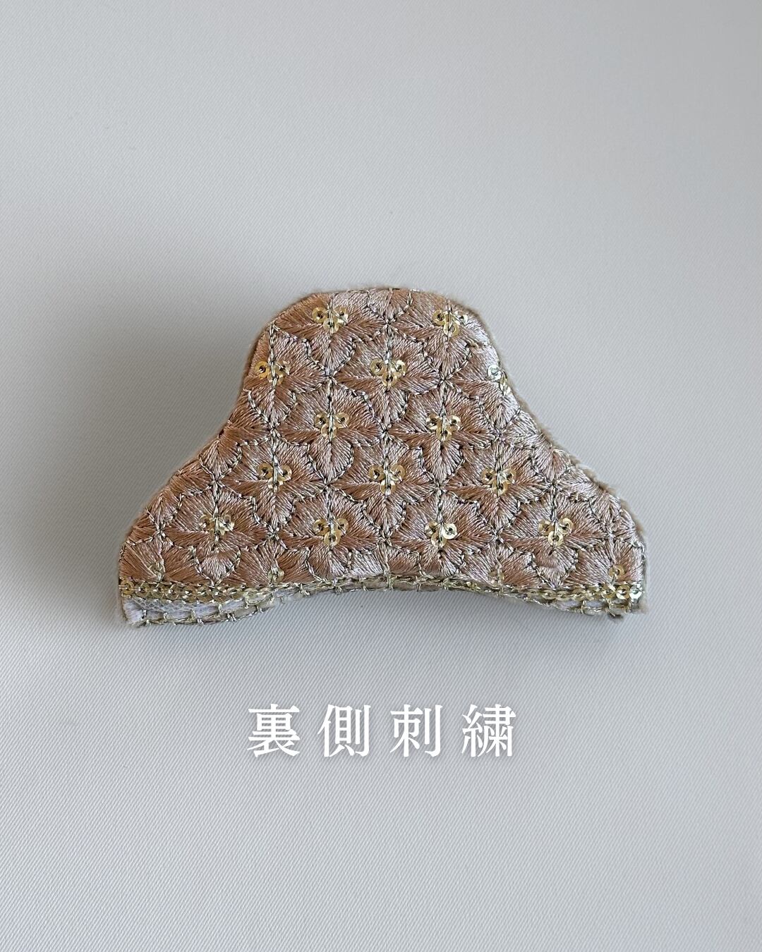 インド刺繍リボンからフリーハンドで切り取り、ひとつひとつ手縫いしています。