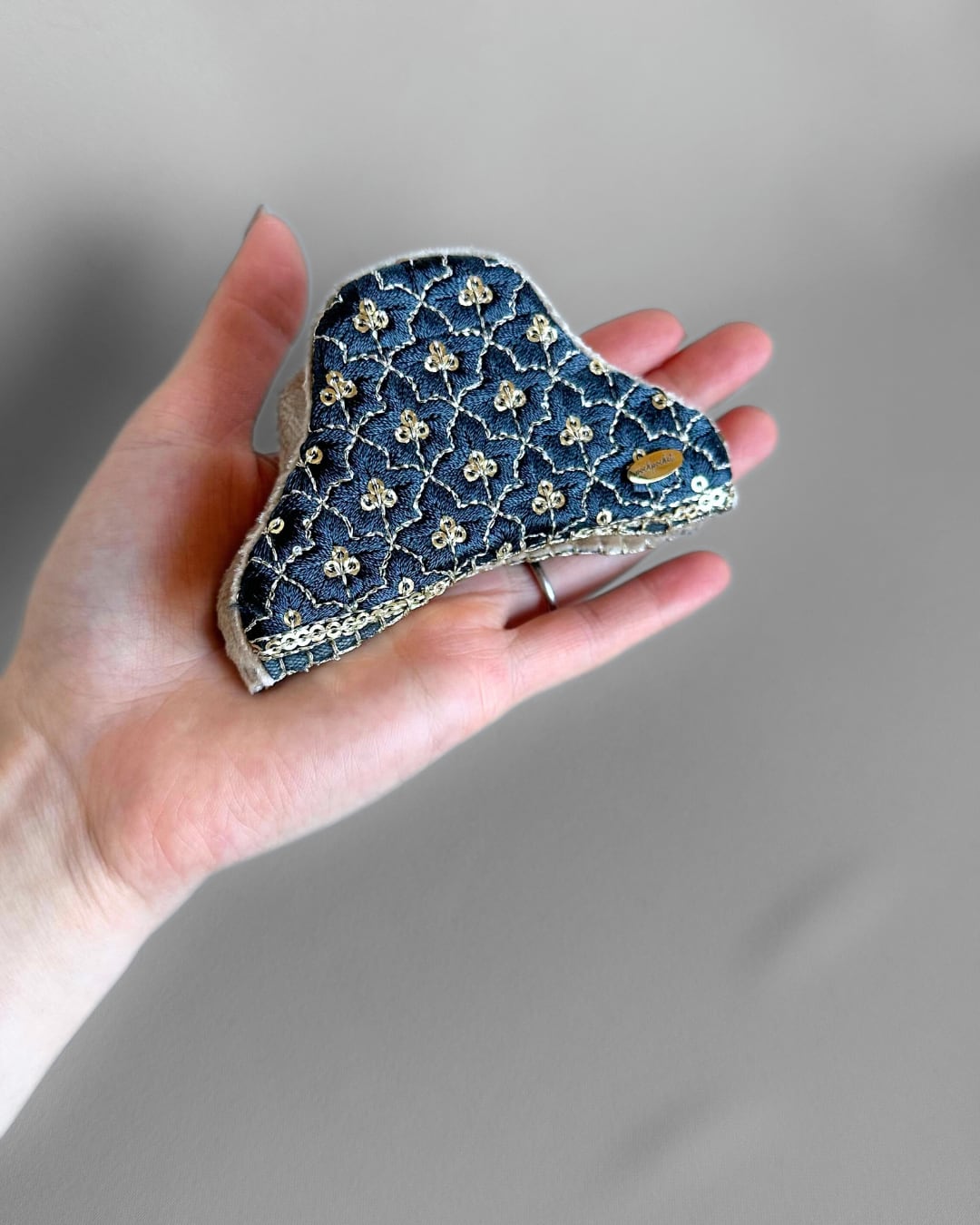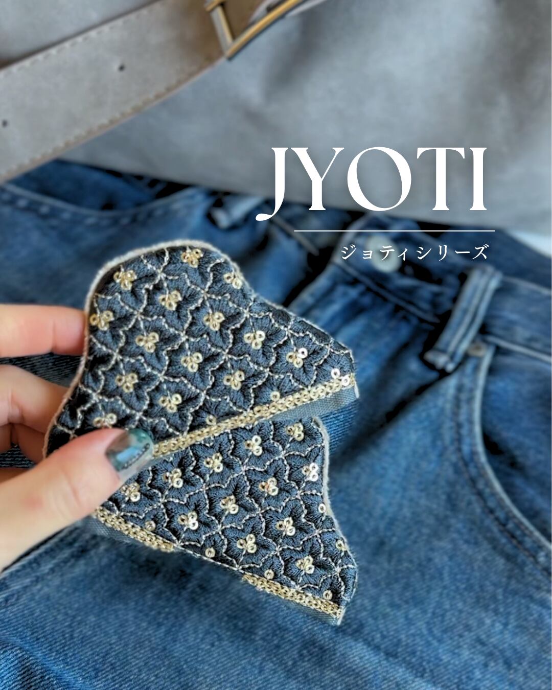 インド刺繍リボンからフリーハンドで切り取り、ひとつひとつ手縫いしています。
