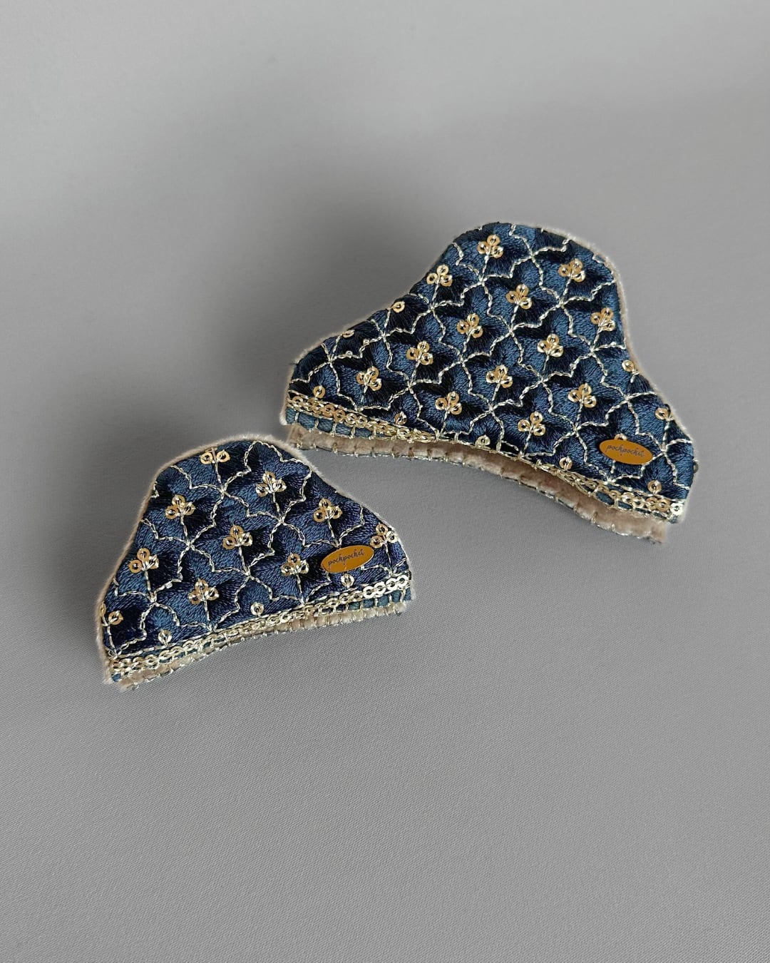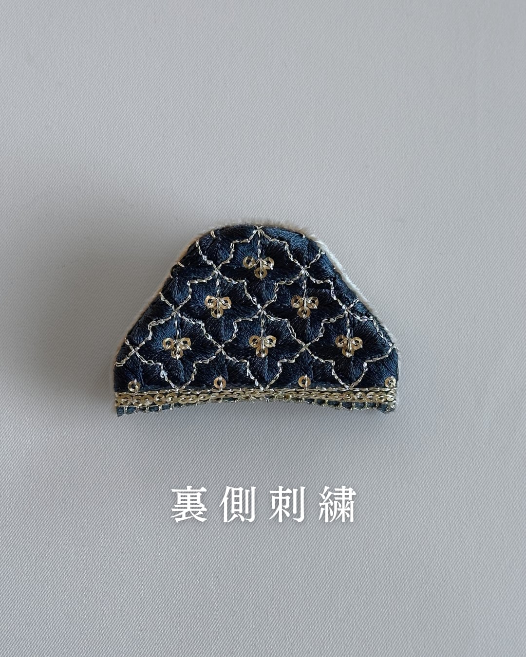 インド刺繍リボンからフリーハンドで切り取り、ひとつひとつ手縫いしています。