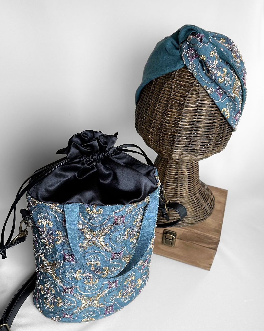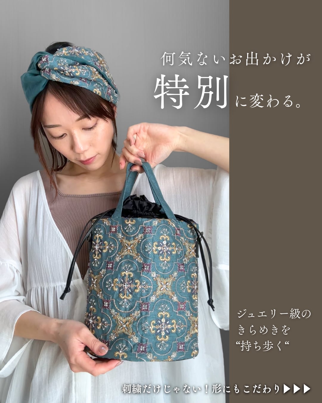ヘアバンドとお揃いのインド刺繍生地を使った