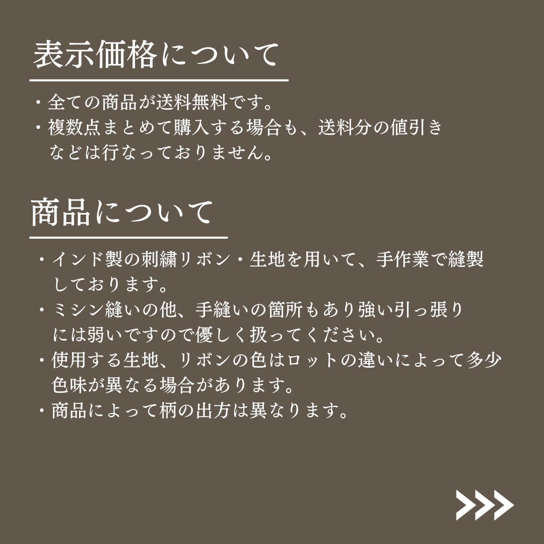 ・インド製の刺繍リボン・生地を用いて、すべて手作業で縫製しております。