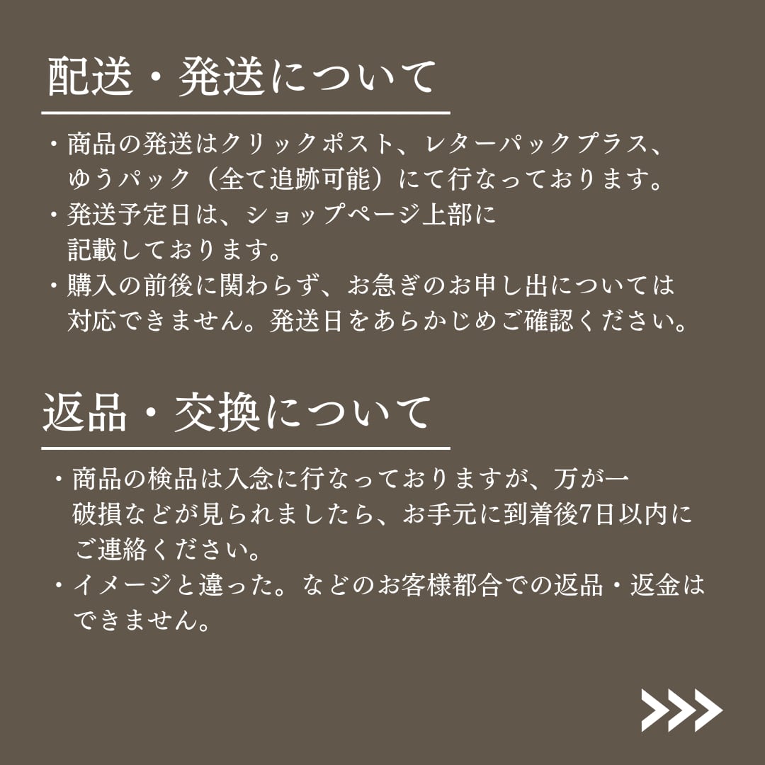 製作、梱包、発送すべて作家1人で行っておりますので、お急ぎ発送・指定日発送など一人一人のご希望に添えない部分がありますことをご理解いただけると幸いです。